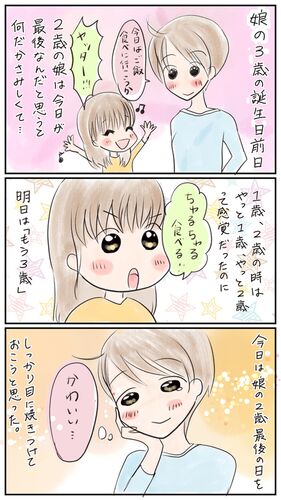 もう12月で今更なんですが、娘10月で3歳になりました!!!!(*'ω'*) 今年は娘の誕生日前日になぜかえらいセンチメンタルになってしまいました1歳の時も2歳の時も「なんとか無事に成長したぞ…」という安堵感とか嬉しい感の方が強かったんですが、今年…